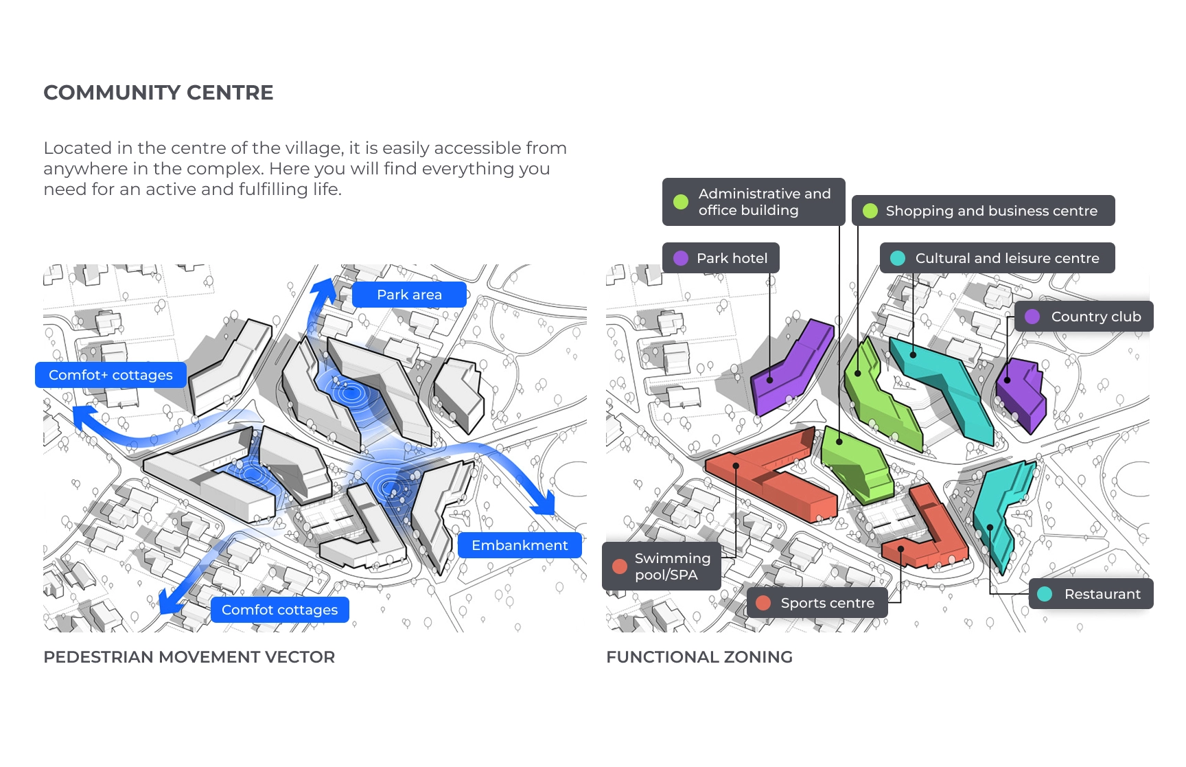 The masterplan features 323 residential plots with a variety of housing typologies: Comfort and Comfort+ cottages, townhouses, and premium block houses with green roofs. Each typology was designed with a focus on privacy, comfort, and integration with the natural surroundings.
