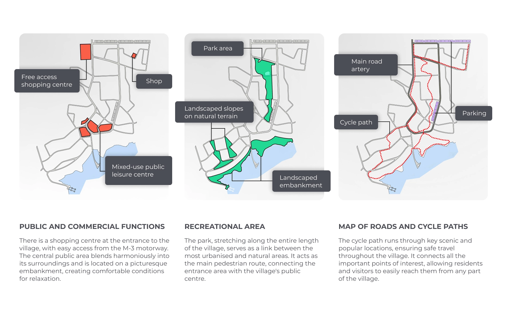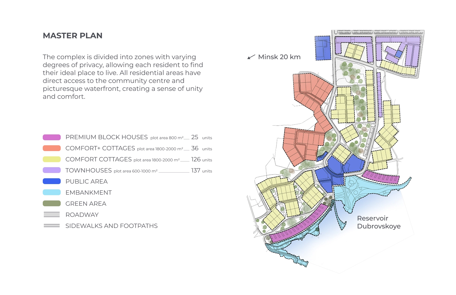 The Dubrovo Residential Club Village is a conceptual design project — the preliminary stage of a large-scale suburban development on the shores of the Dubrovo Reservoir in Belarus, covering 52 hectares. The concept was created to present the development idea and communicate the vision to potential investors.