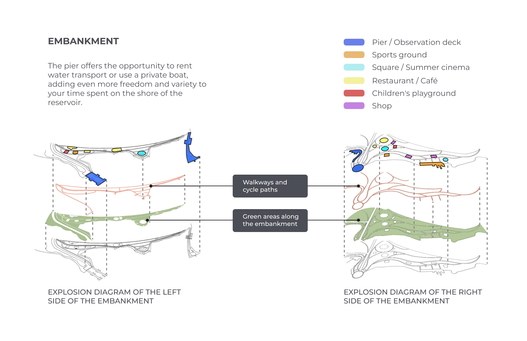 The waterfront area plays a defining role in the masterplan: pedestrian and cycling routes, sports and children’s playgrounds, an open-air cinema, and a marina with berths for yachts and boats create a resort-like lifestyle for residents.