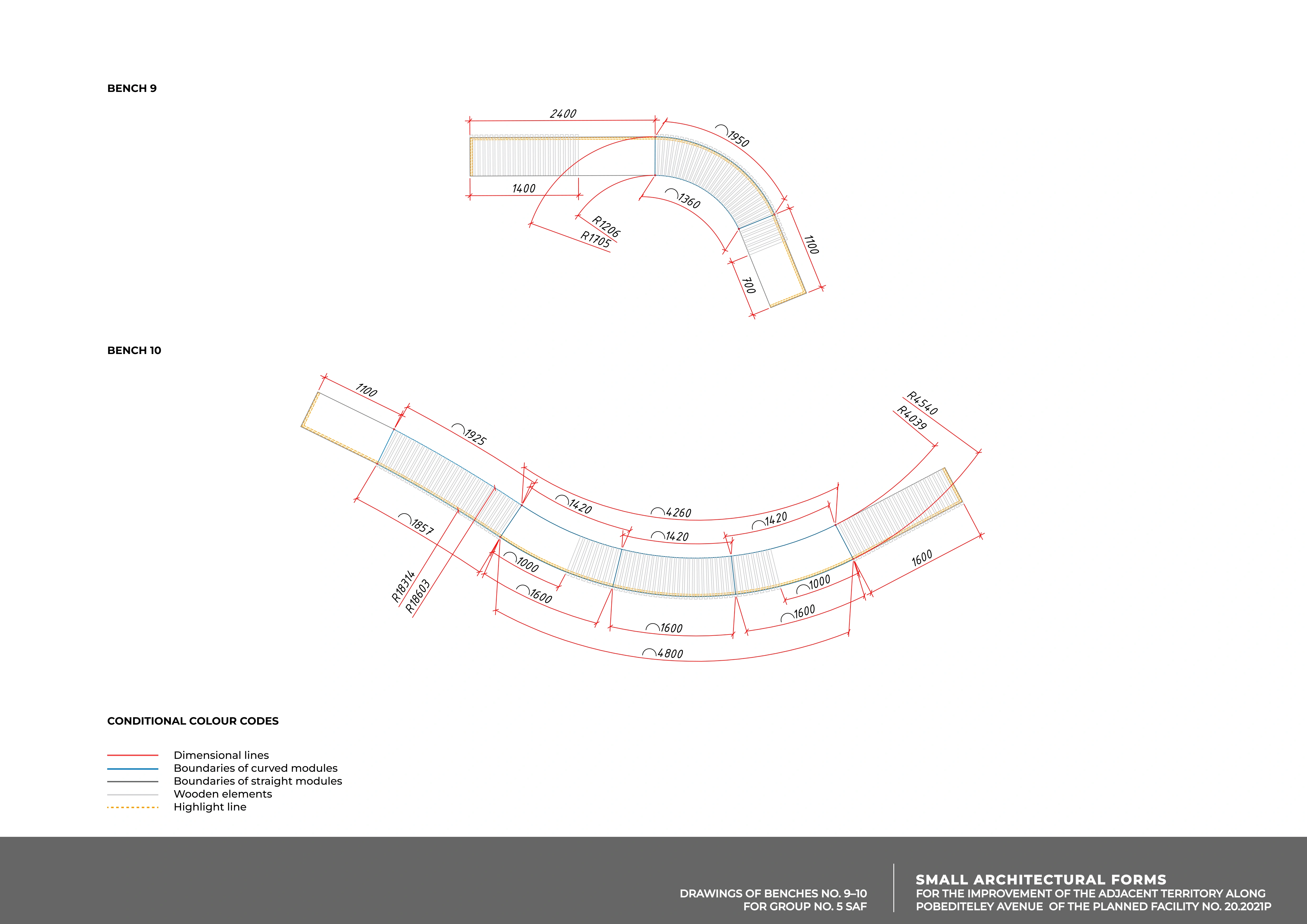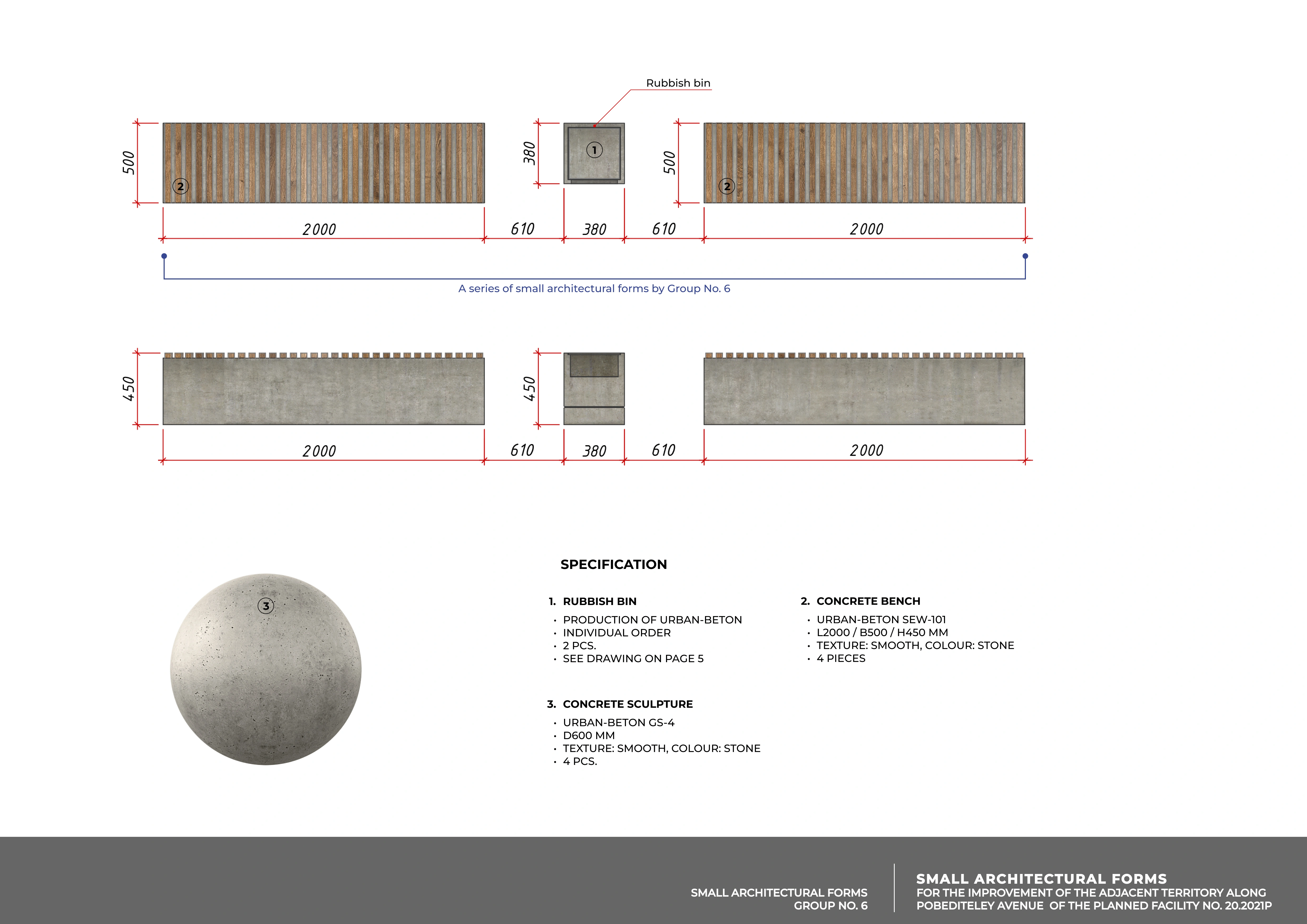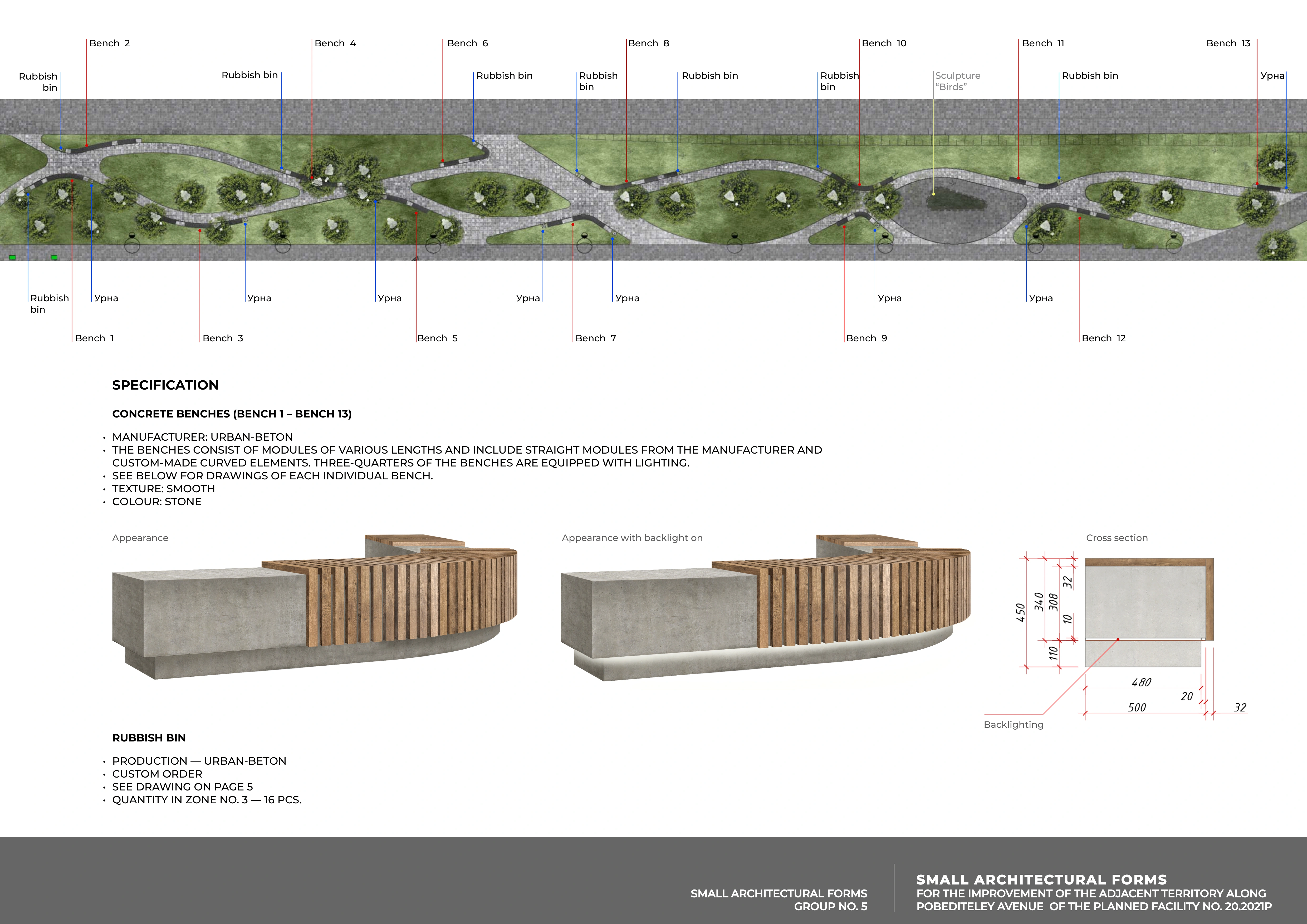 — Street furniture: linear and radius benches, seat‑curbs, litter bins, bicycle parking, wayfinding.