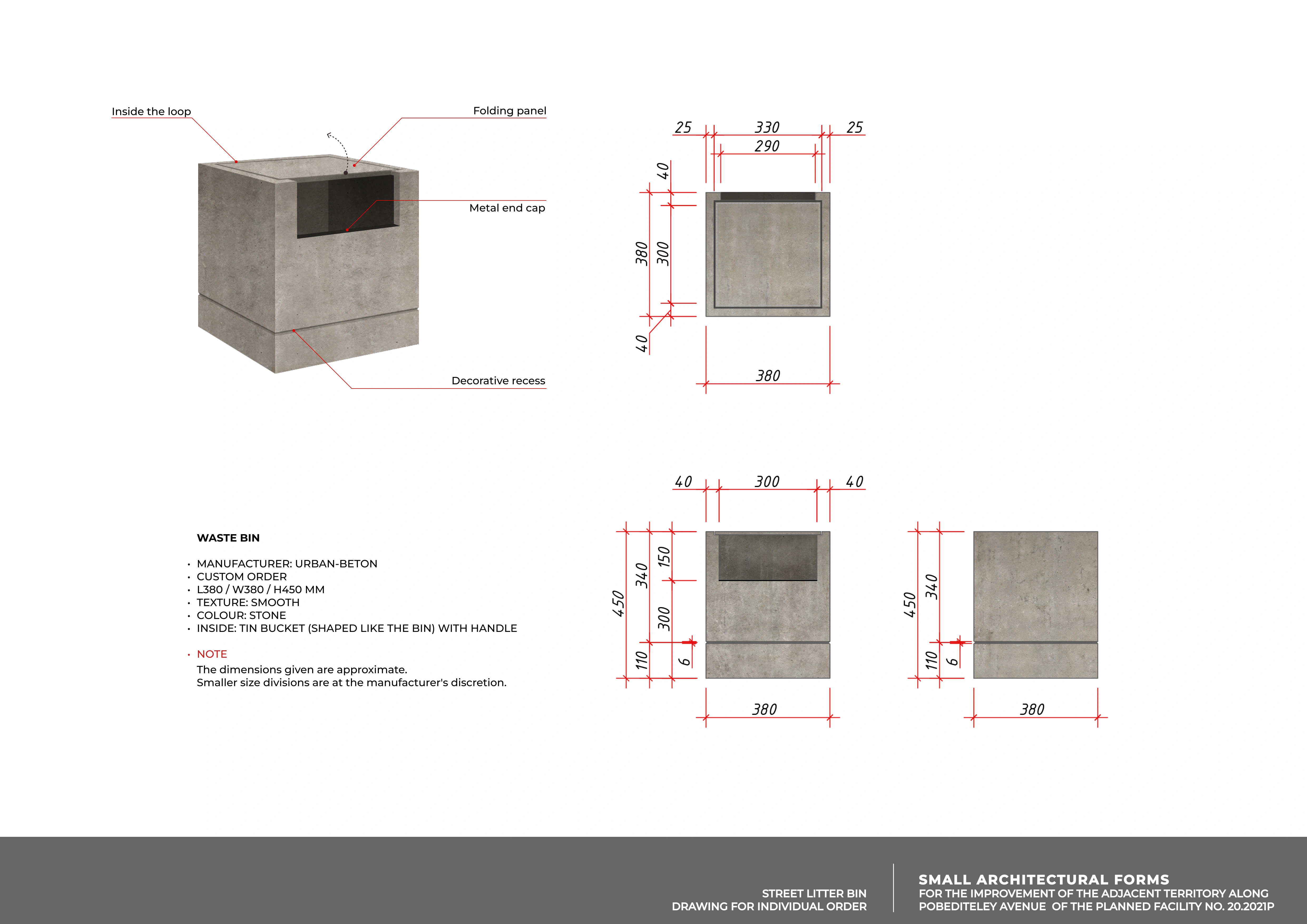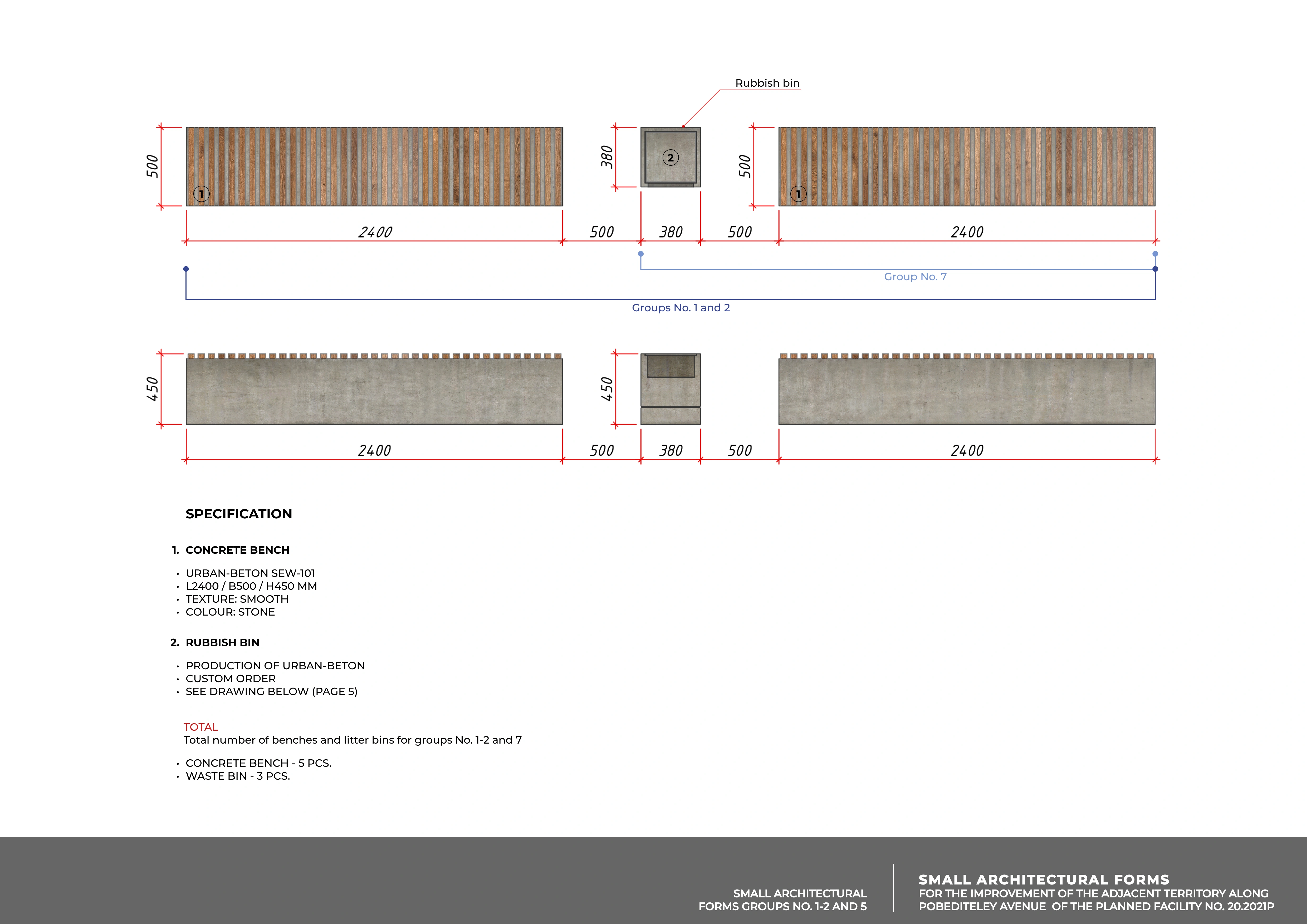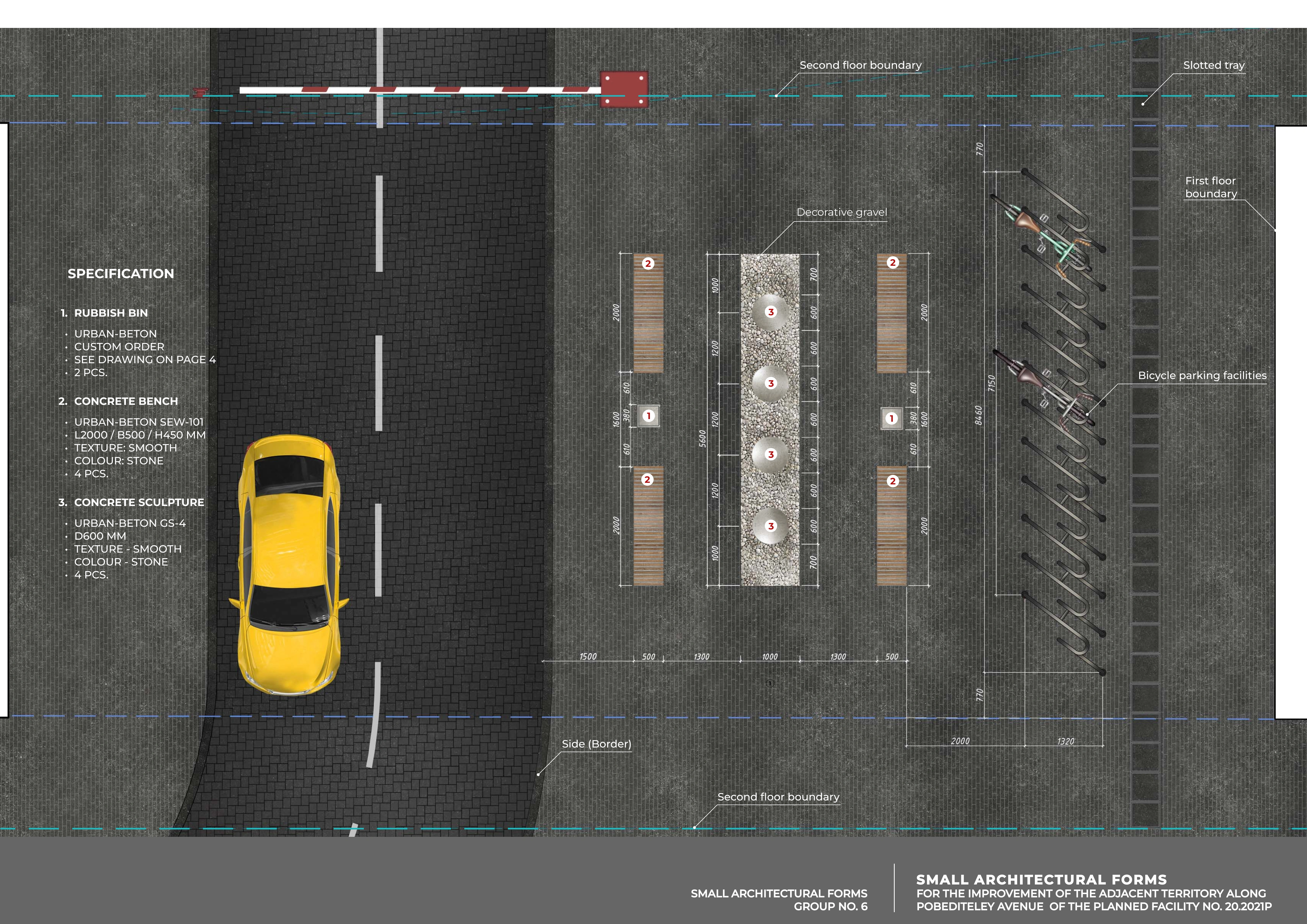 — Street furniture: linear and radius benches, seat‑curbs, litter bins, bicycle parking, wayfinding.