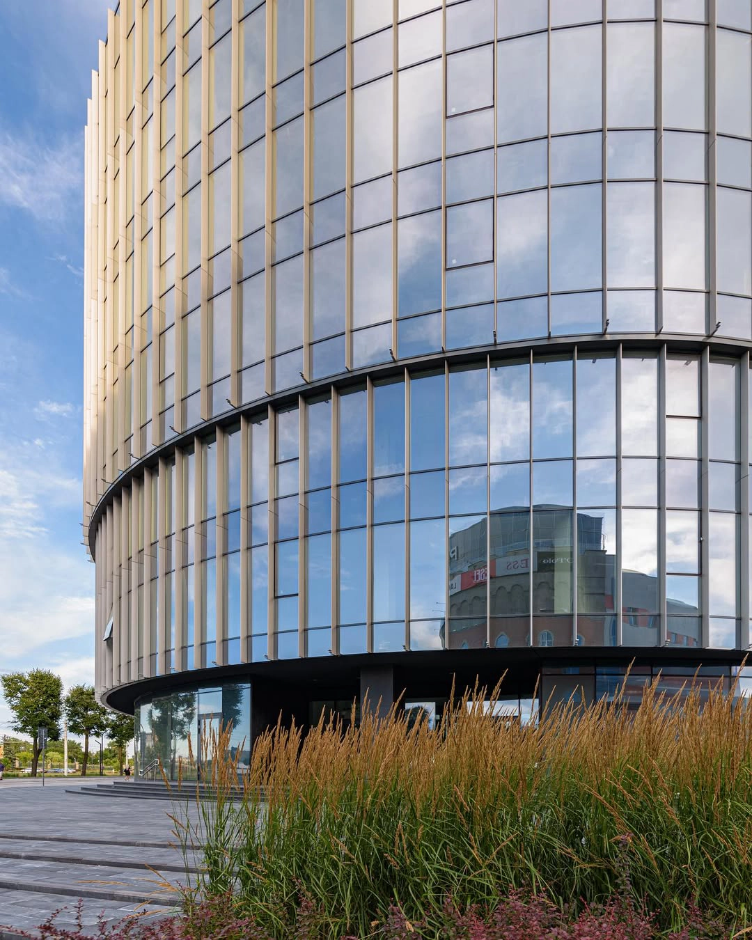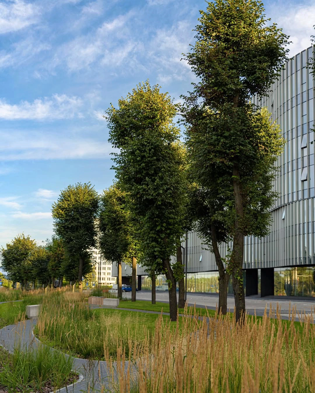 Photos of the landscaping of the surrounding area of the multifunctional complex on Pobediteley Avenue, Minsk