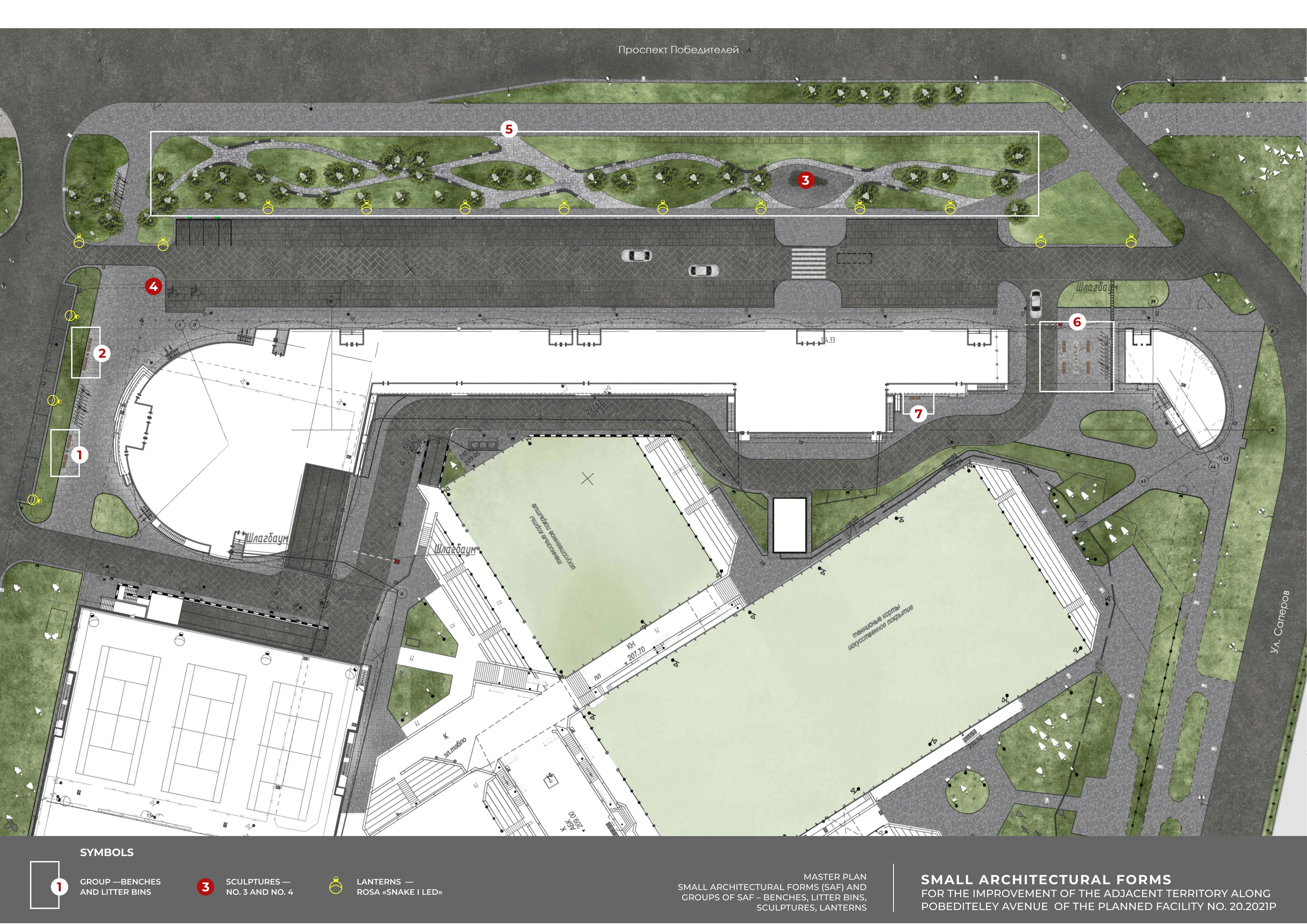 The forecourt is reframed as the complex’s urban threshold: continuous, legible routes tie together key destinations, while furniture and lighting structure the space and improve comfort and safety.