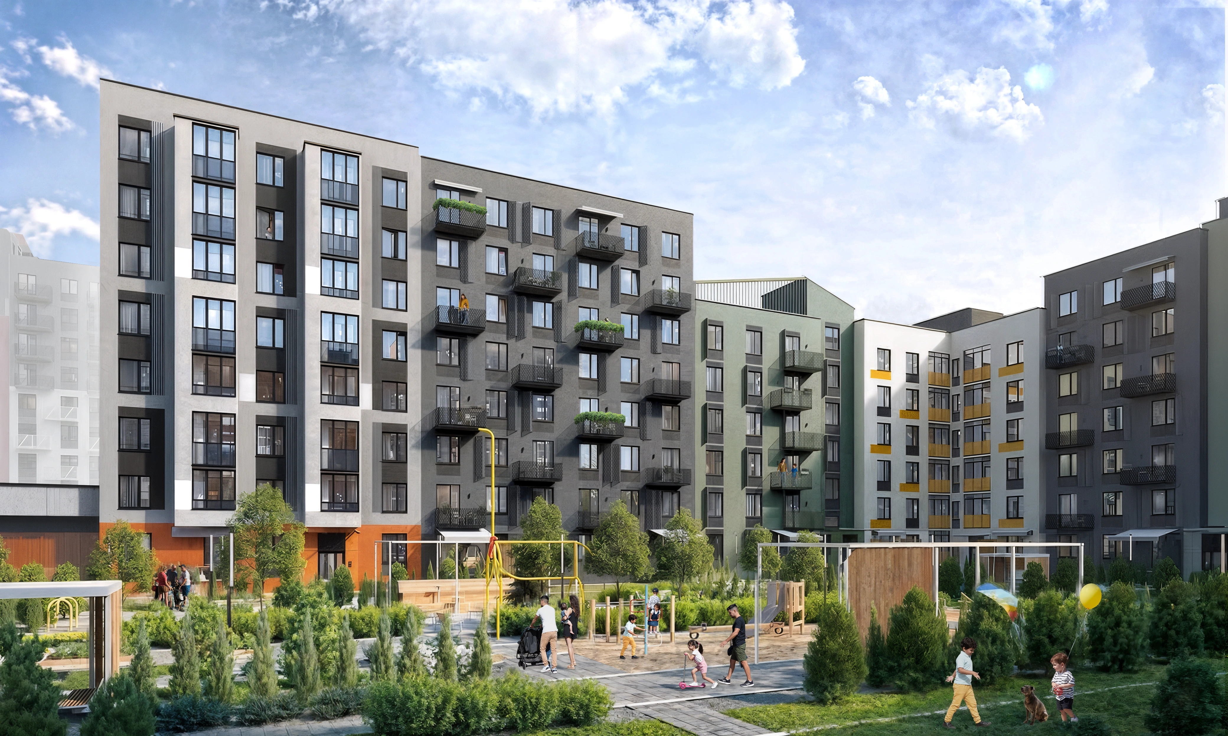A perimeter‑like composition and an L‑shaped volume for House 1.8 shape a sheltered micro‑courtyard; view corridors open to the forest and the Art Boulevard; active routes and noisier functions are placed at the edges, preserving quiet in the core.