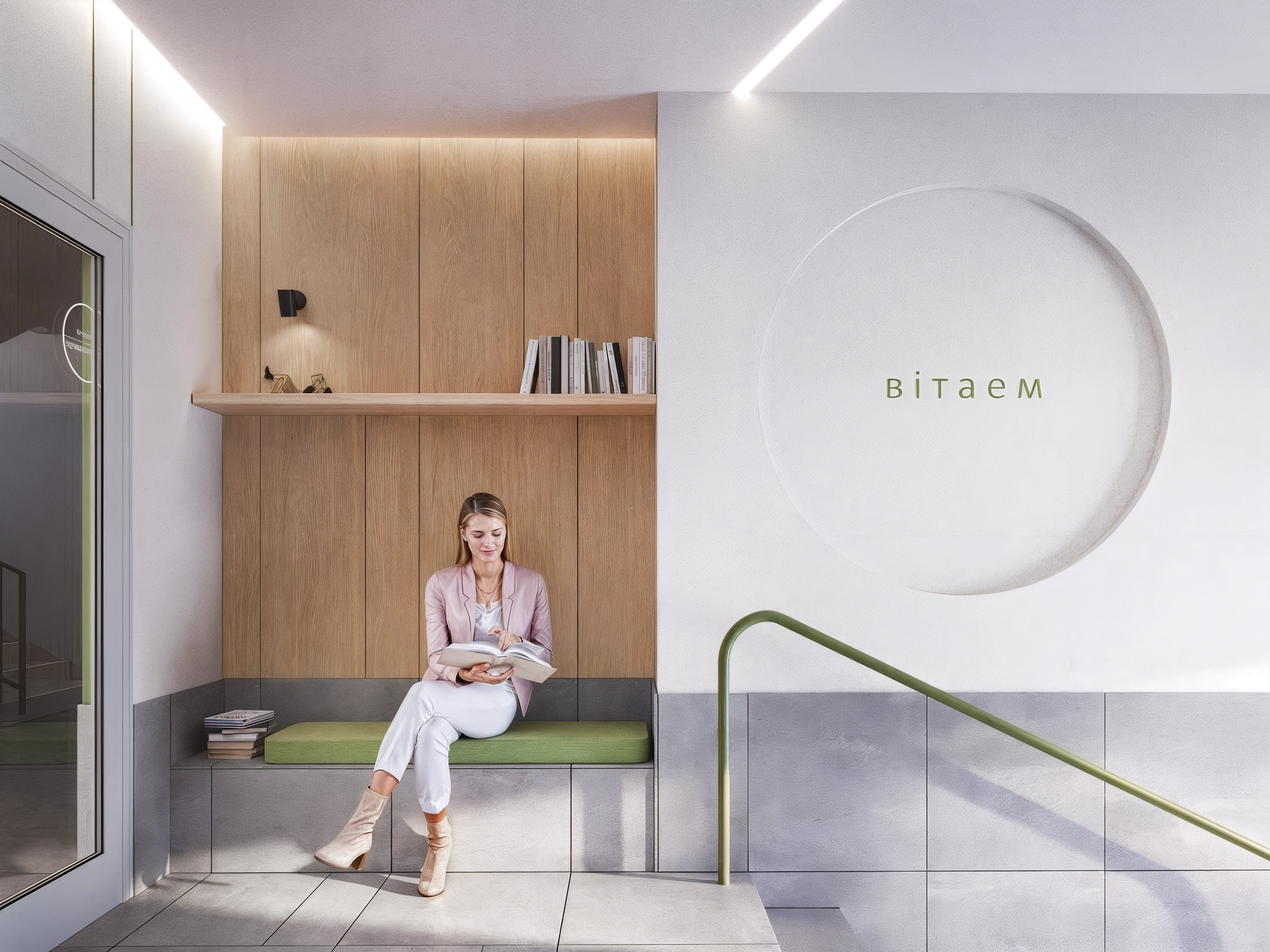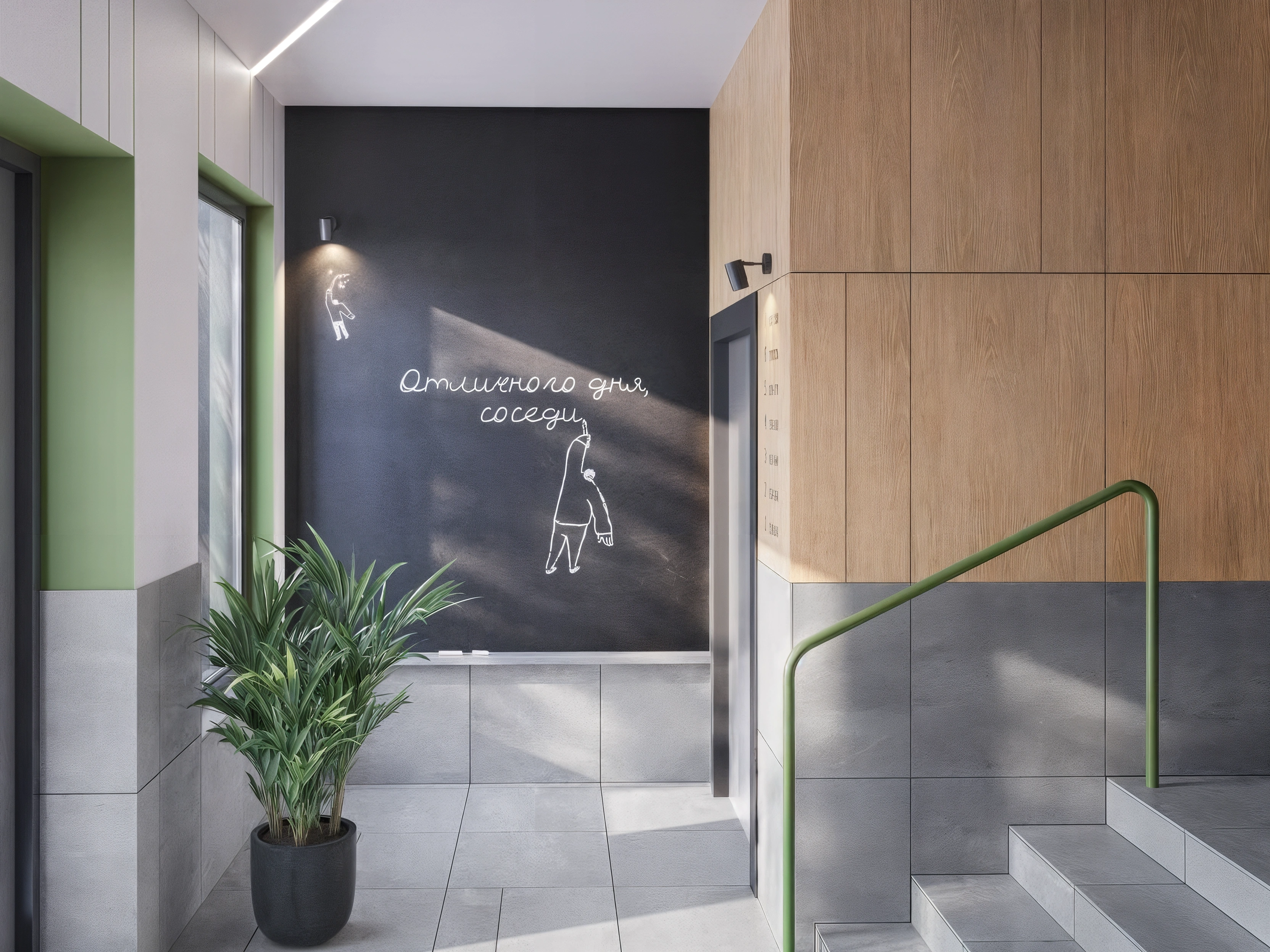 The lobbies follow a concise minimalism with a warm Scandinavian note: large-format gray porcelain stoneware and light walls provide a neutral backdrop, while oak-toned wall panels and olive accents add tactility and a welcoming character; an integrated bench niche with a shelf creates a waiting spot, linear light profiles and concealed lighting emphasize geometry, and a rounded olive handrail guides movement without visual noise; a graphic chalkboard wall and restrained wayfinding give the space a friendly voice, and live plants soften the palette, resulting in a calm, durable, and user-friendly common interior for everyday use.