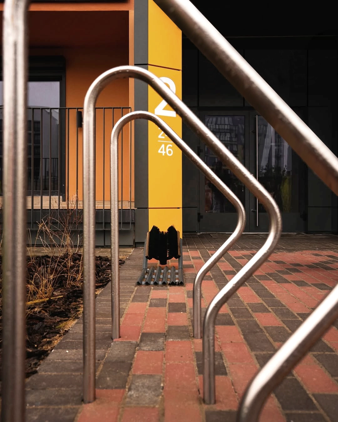 -Large-scale wayfinding graphics on the entrances reinforce identity and orientation.