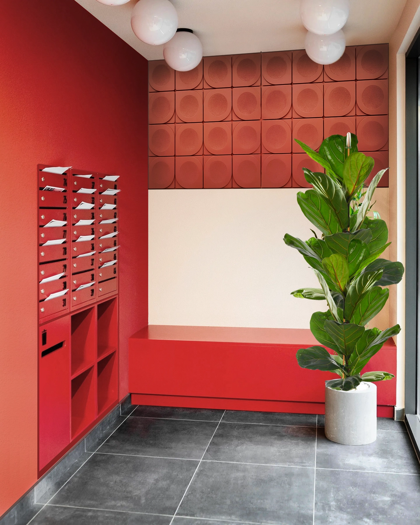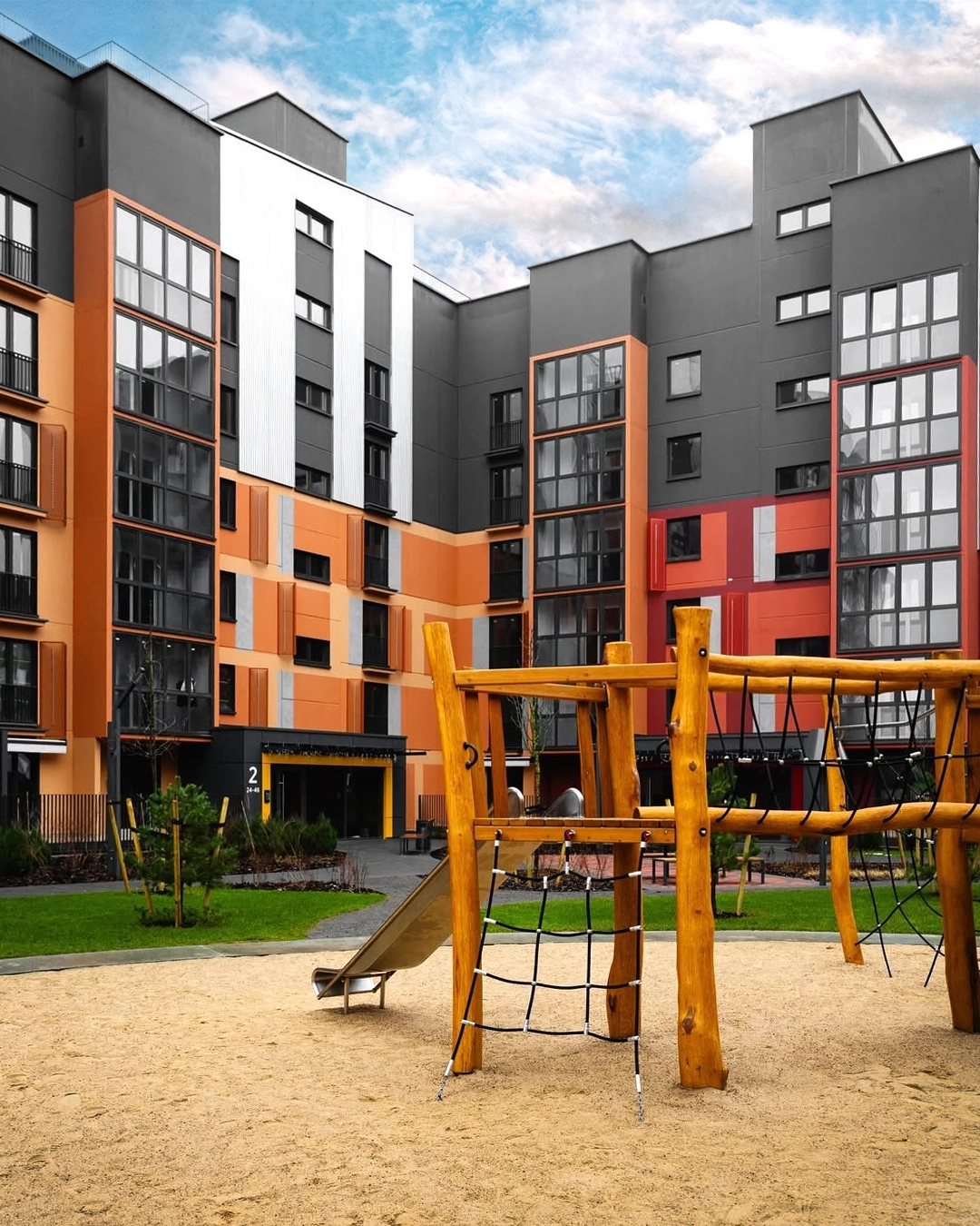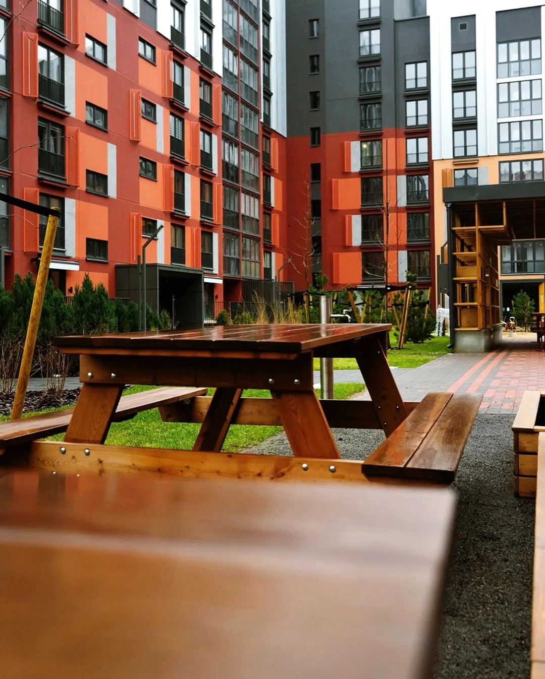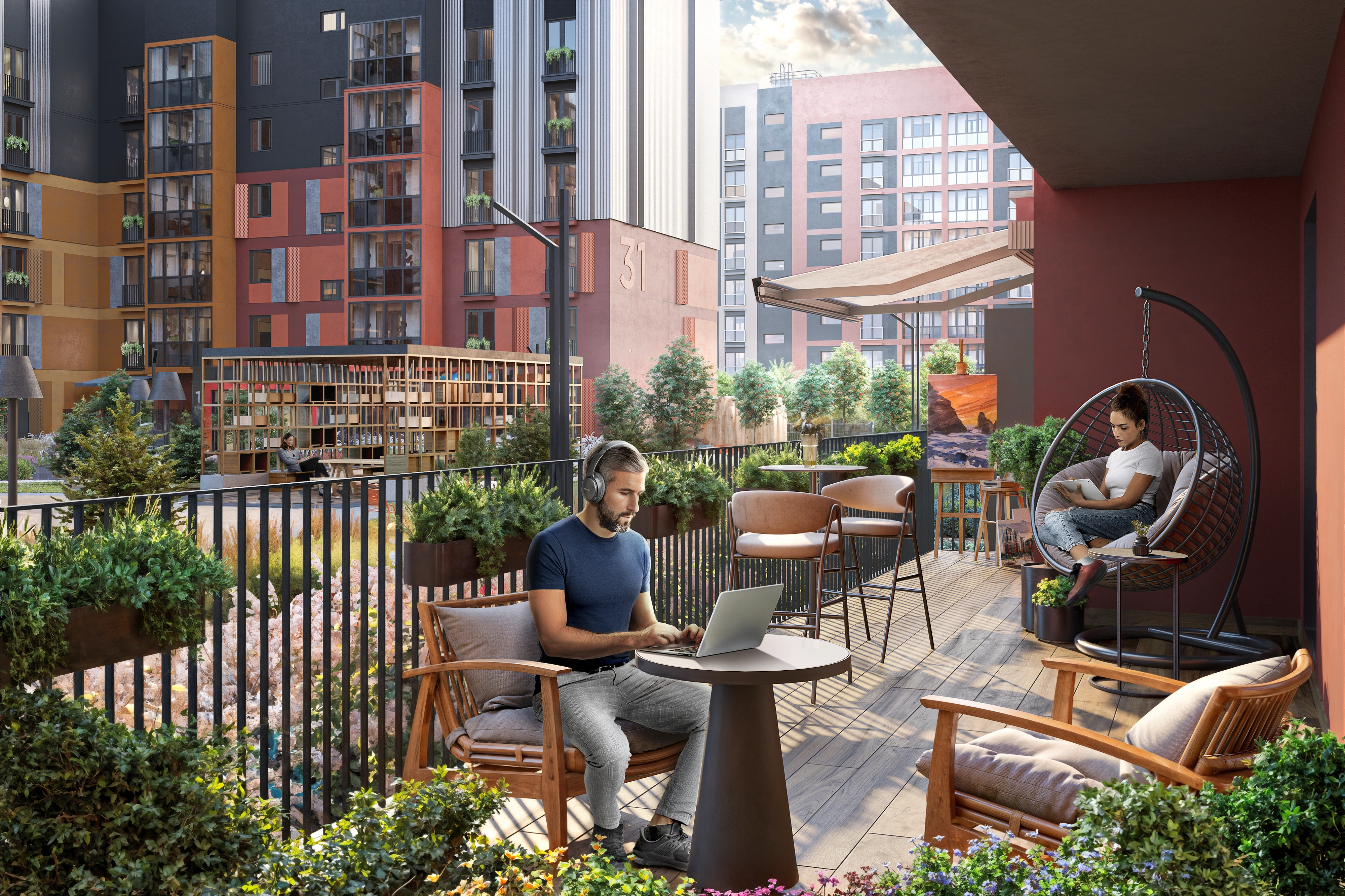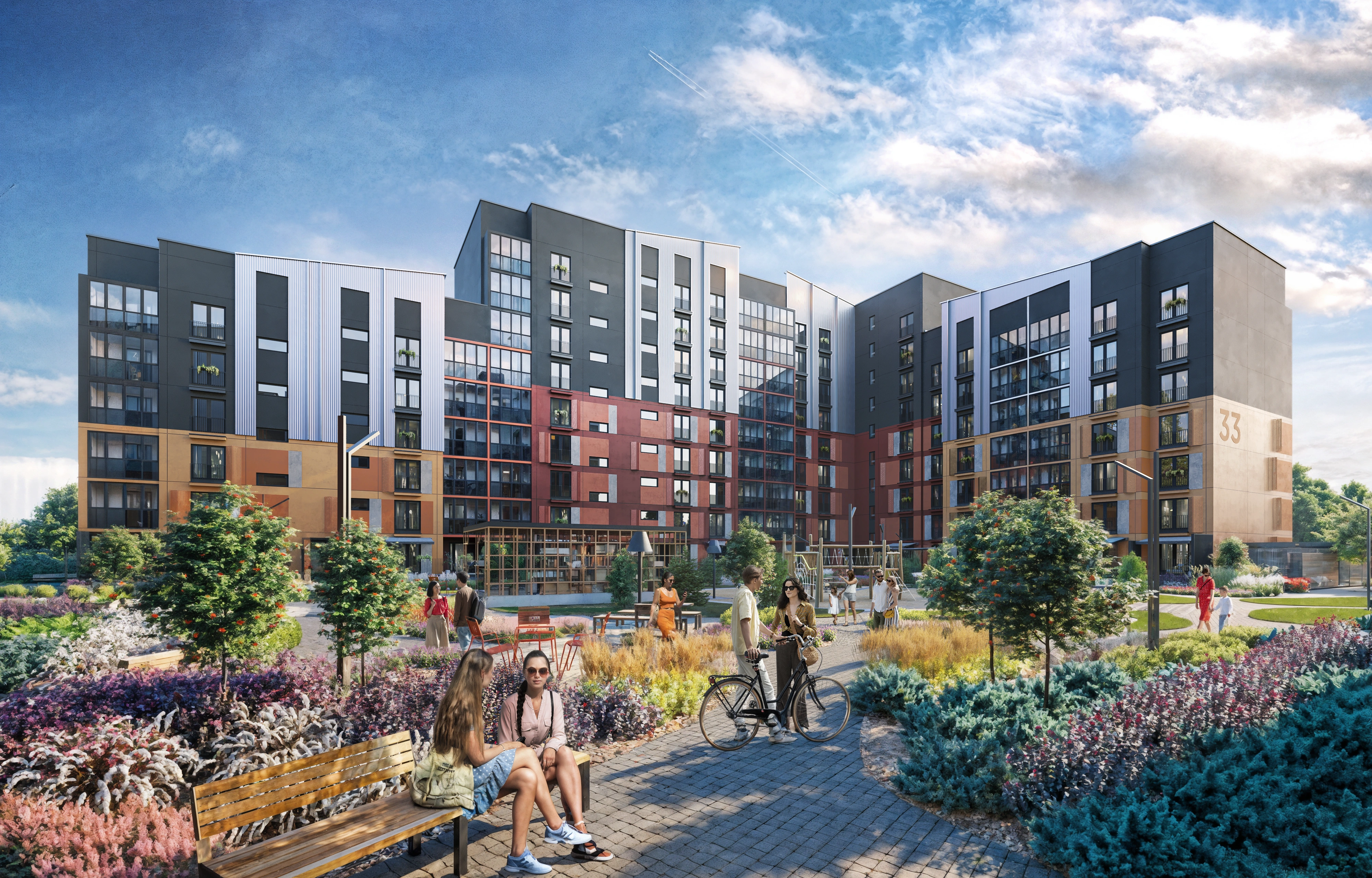 The project was designed as a cohesive ensemble where architecture and landscaping merge into one identity. Two buildings form a semi-enclosed courtyard that blends privacy with openness toward the adjacent Central Park. The symbolic rowan trees and lush greenery shape the quarter’s identity, while the courtyard acts as an urban living room filled with furniture, floor lamps, greenery, and tiled patterns reminiscent of a home interior brought outdoors.