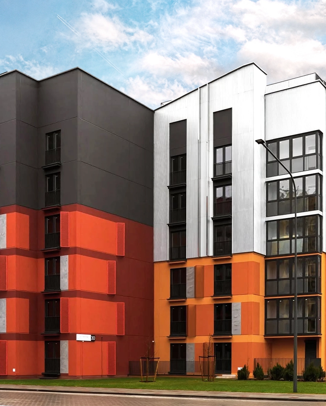 — Materials. Ventilated facades mix metal panels, profiled steel, textured plaster surfaces, and panoramic French windows.