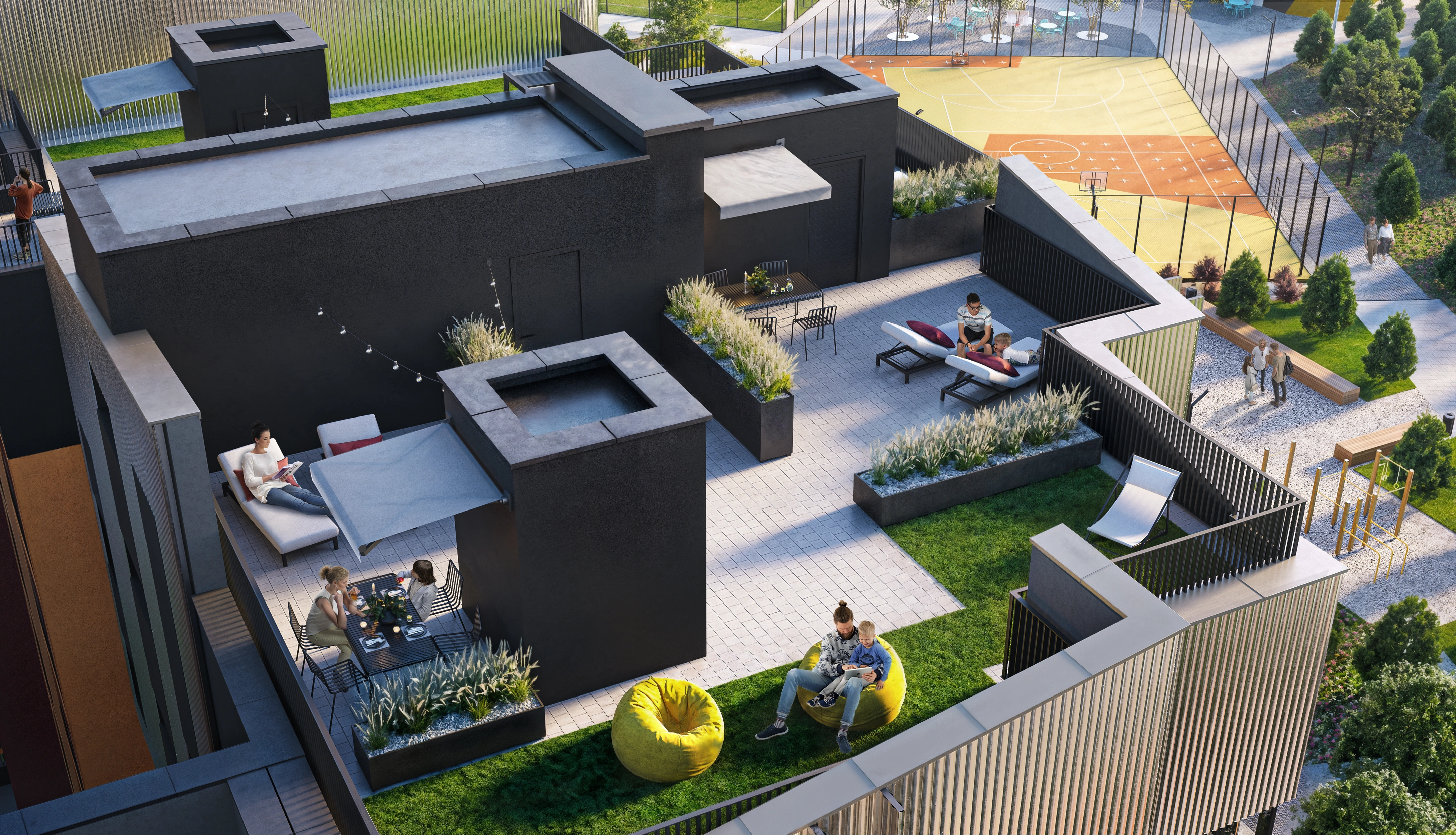 — Rooftop and ground-floor terraces. Apartments with private terraces face both the courtyard and the Central Park; one section features an exploitable rooftop with panoramic views.