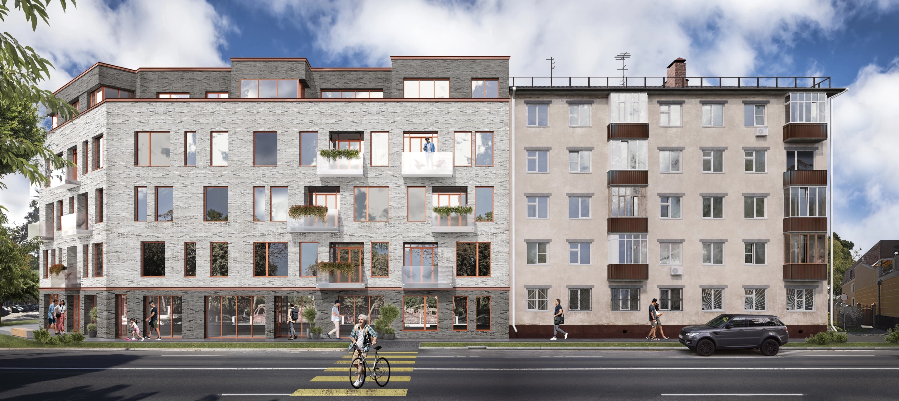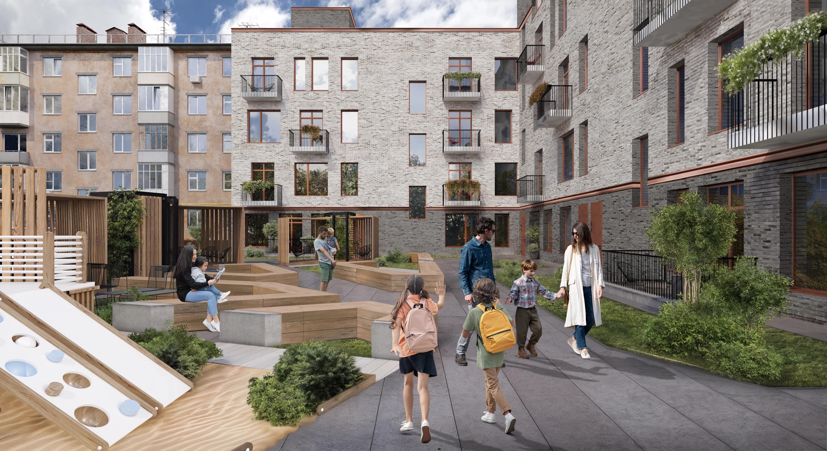 Lead designer: full facade concept development, visualization, project presentation to the client, authorship of “color coding” and street/courtyard spatial solutions. Collaboration with an architect responsible for technical planning adaptation to existing layouts.