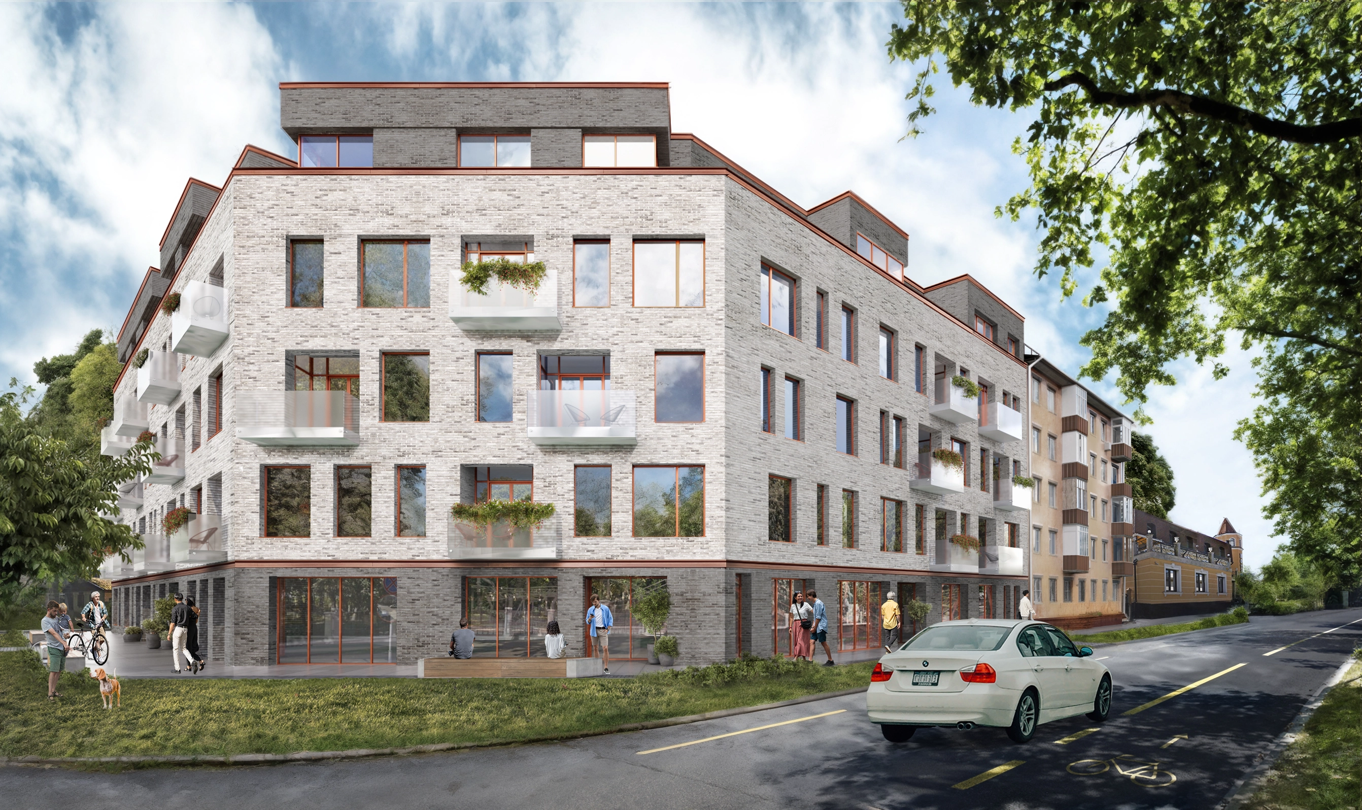 The client’s brief required a facade transformation that would convey strictness and modernity, using clinker brickwork as the key material. Initial concepts explored a warm, orange-brick palette for maximum contrast and identity. This evolved — through dialog and review — into the final solution: most of the facade is clad in light gray clinker brick, with deep charcoal clinker defining the ground floor and penthouse levels. The dark base anchors the building, while crisp, orange profiles for window frames and bands create a memorable, contemporary accent and visual continuity. The courtyard landscaping was also reimagined to provide a safe, lively space for relaxation and play.